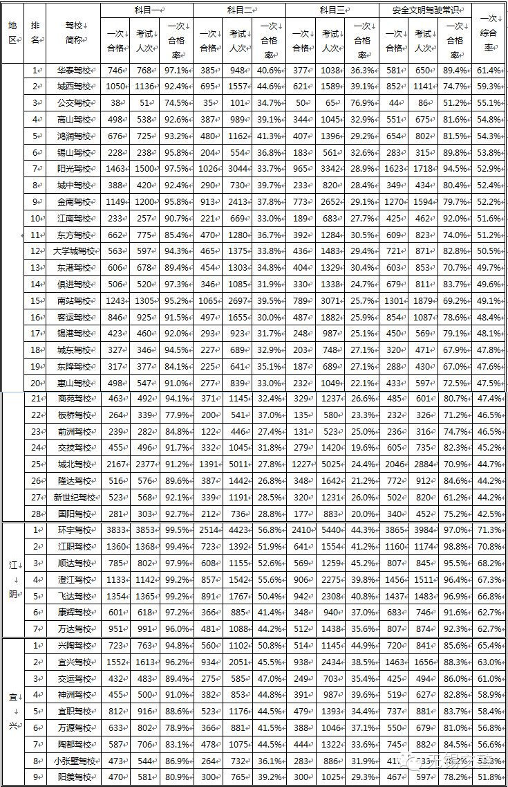 同时附上今年一季度全市驾校考试质量排行榜,小伙伴们集体来围观吧: